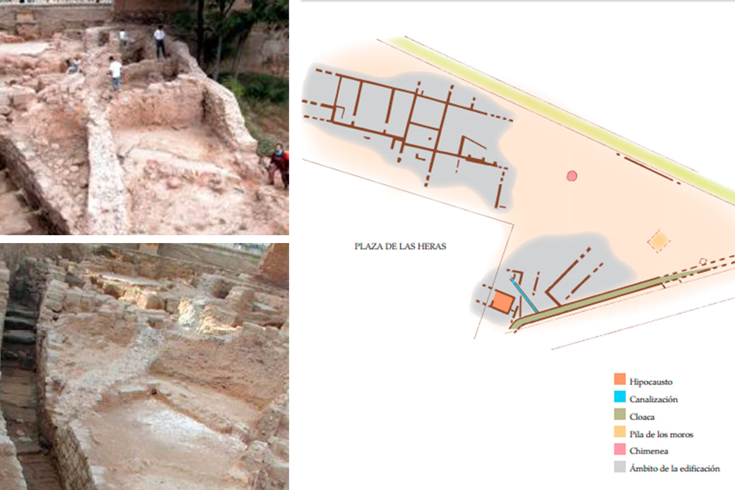 Las excavaciones de la década de los 1980 sacó a la luz un edificio monumental romano que ocupaba lo que antes era el antiguo cementerio de Calahorra, lo que ahora es el patio escolar del colegio Ángel Oliván de la misma Calahorra. El edificio no es de distribución de domus o casa privada, sino de carácter público, que es evidente...